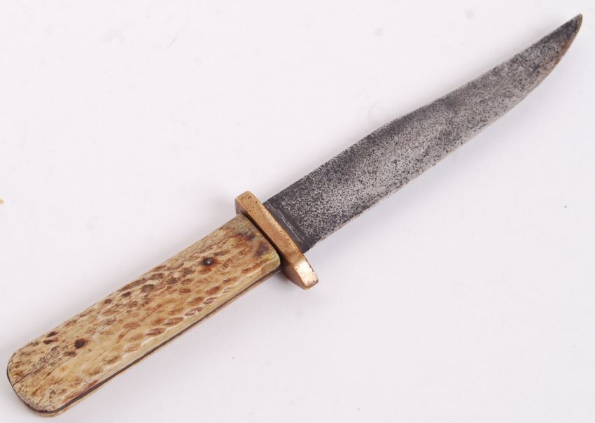 An original vintage WWI First World War era made Bowie type knife. Marked 'Sheffield Cutlery' to the blade, with carved bone grips. Measures; 25cm long