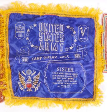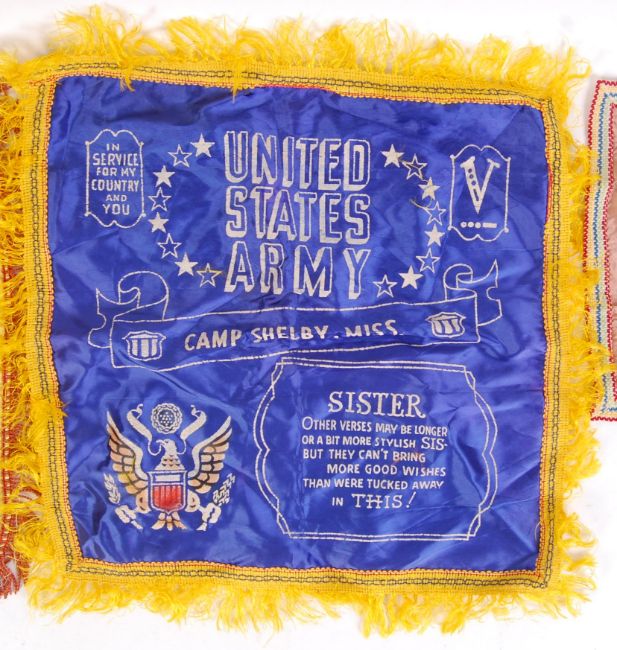 A collection of 3x WWII Second World War Sweethearts related items. To include a ' Greetings From England ' handkerchief, a US Army 'Sweetheart ' cushion cover and another US Army cushion cover for 'Sister'. The two covers with verses to the front.