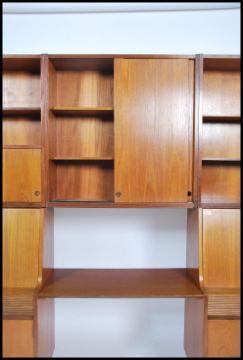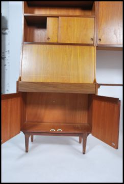 A stunning 1960's teak wood modular wall system in the manner of Robert Heritage for Archie Shine. The system with twin bureau's comprising a series of cabinet, cupboards and shelves. Believed to be retailed by Waring & Gillows