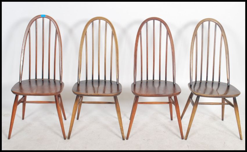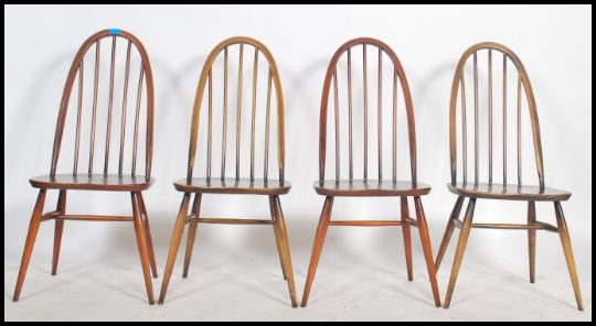 A set of 4 20th century Ercol windsor pattern beech and elm dining chairs with saddle seats and turned legs united by stretchers. Arched and railed backs to each. Measures 98cms x 43cms x 43cms.
