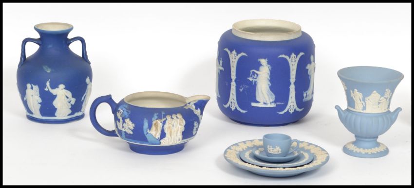 A collection of Victorian and other Wedgwood jasper cameo ware ceramics to include a pair of Wedgwood and Co Ltd twin handled vases and jug in cobalt blue with a group of lighter blue Wedgwood ceramics. Please see images. Measurements: 10 cm highest and 12 cm widest.