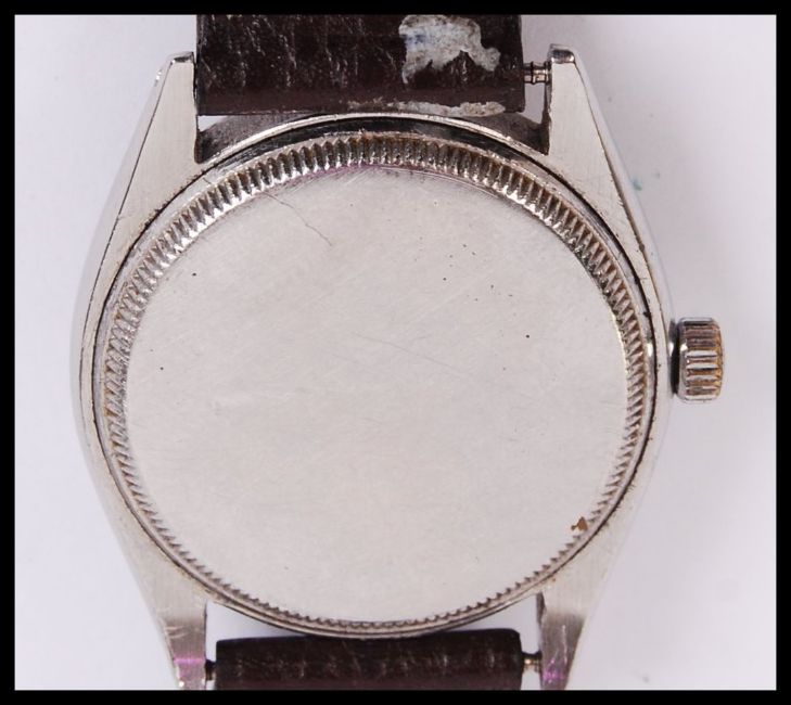 A vintage 1940's Rolex Oysterdate Precision wristwatch having square baton numerals and numbers at the quarters. Date aperture to centre right with faceted gold hands. The movement marked Patented Super Balance , 17 Jewels Swiss movement. Set to a brown leather strap.