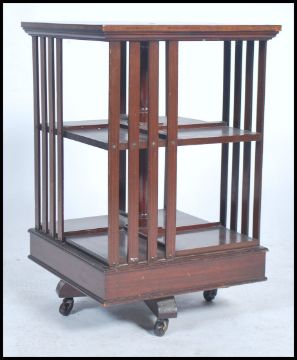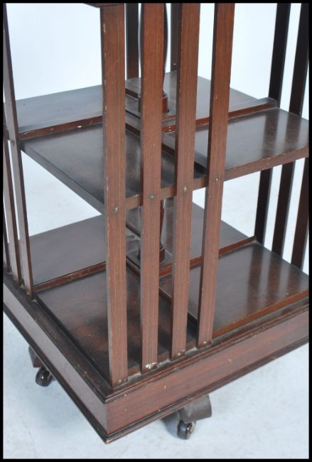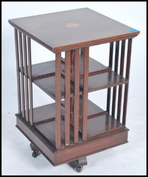 An Edwardian mahogany inlaid revolving bookcase having slatted form with section revolving pedestal body raised on castor base. Measuring 71cms x 45cms x 45cms
