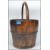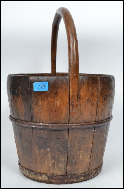 A vintage 19th century Chinese wooden bucket having shaped handle atop and metal bands.