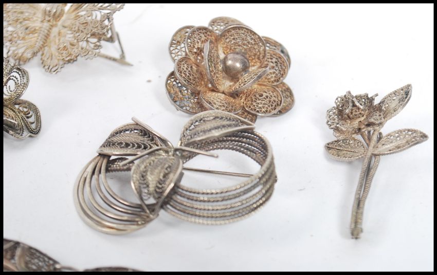 A collection of vintage silver filigree jewellery to include bracelet, brooches, pendant etc please see images.