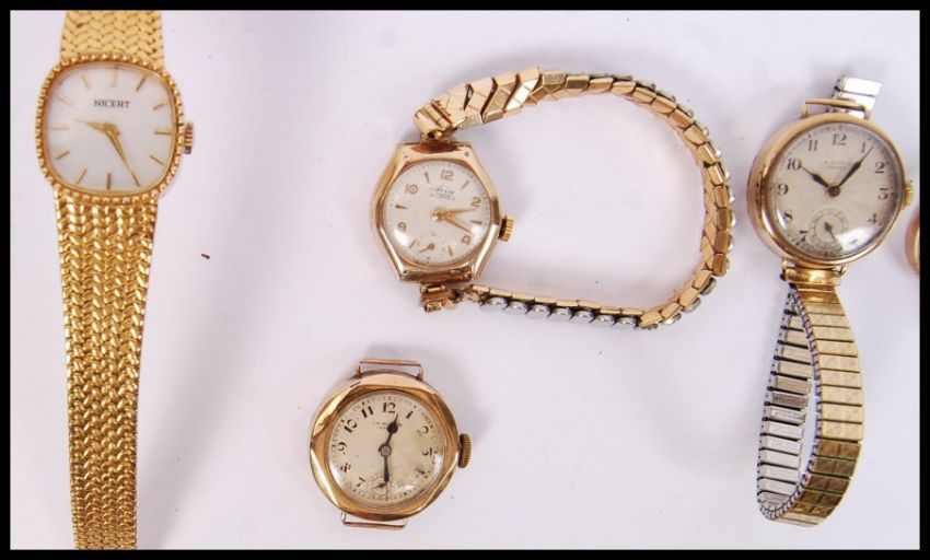 A collection of vintage gold wristwatches to include a 9ct gold JW Benson london watch, Avia 9ct gold ladies dress watch on yellow gold expanding strap, another 9ct gold watch lacking strap by Benson of London, 9ct gold Roamer  17 jewel incabloc cocktail watch on expanding strap and a yellow metal Nicert watch. Weight 74.2g ( gold watches only )