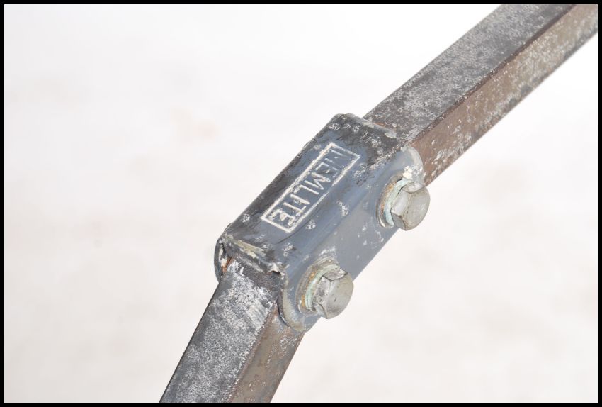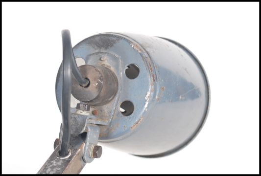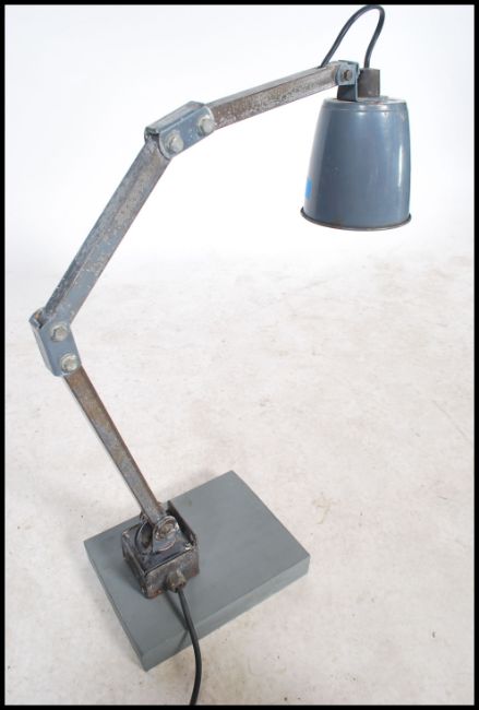A vintage 20th century Industrial Memlite anglepoise desk - wall mounted work lamp in original grey paint with square arms and pendant shade with original switch fitted to base and mounted onto a grey wooden plinth.