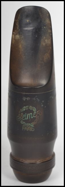 A vintage 20th century Selmer horn mouthpiece for a saxophone, with stamps to each side. Measurements: 10 cm long, 3 cm wide and 3 cm deep.