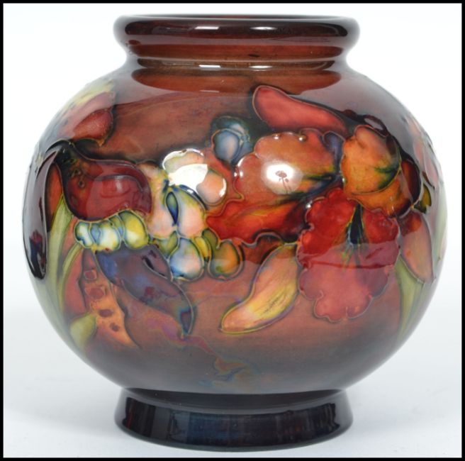 A mid century Walter Moorcroft globular ceramic vase painted and tube lined with flowers. The bulbous body raised on a circular foot with short flared rim. Walter Moorcroft signature to base with green Moorcroft and Made In England mark to base. Measures 13cms high. Condition Report: In good order with no visible damage or repair.
