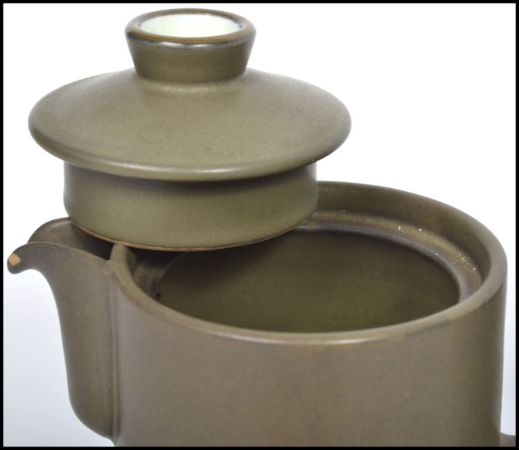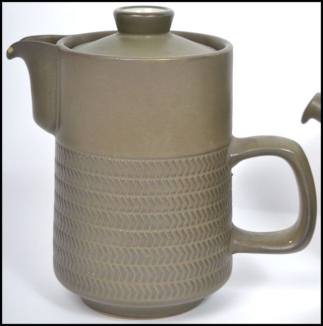 A vintage 1960's stoneware Denby teapot together with the matching creamer and sugar bowl. Measurements: 20 cm high, 21 cm wide and 15 cm deep.