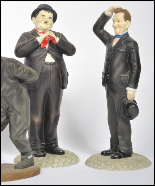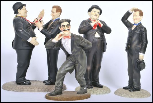 A group of 1930s / 40s film memorabilia TV stars figurines to include a Laurel and Hardy figurine group, Groucho Marx, and Laurel and Hardy individually, each raised on plinth bases.