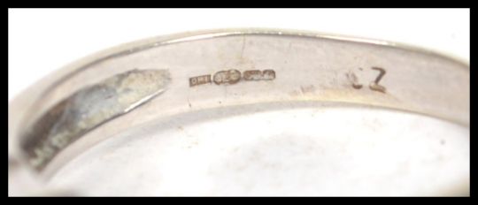 A hallmarked 9ct white gold ring ring having a central princess cut CZ stone. Weighs three grams and is size O.
