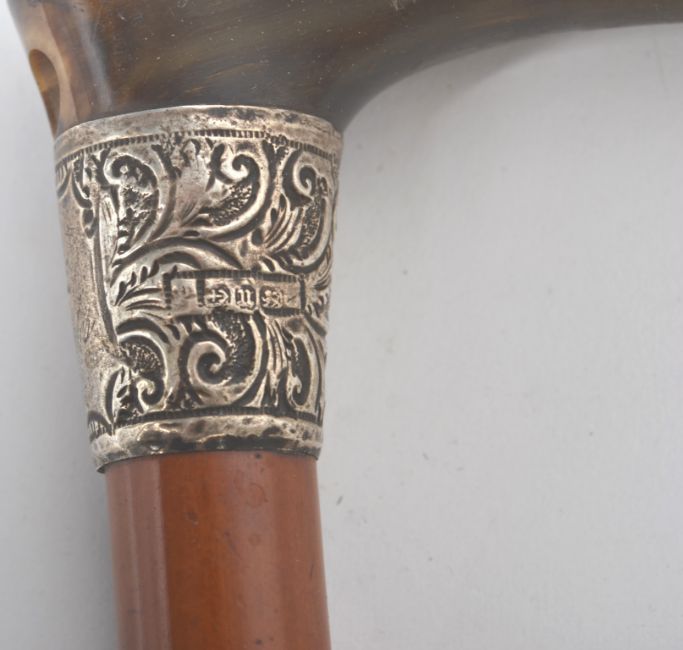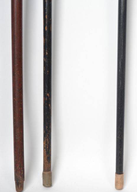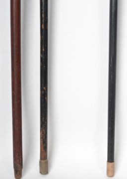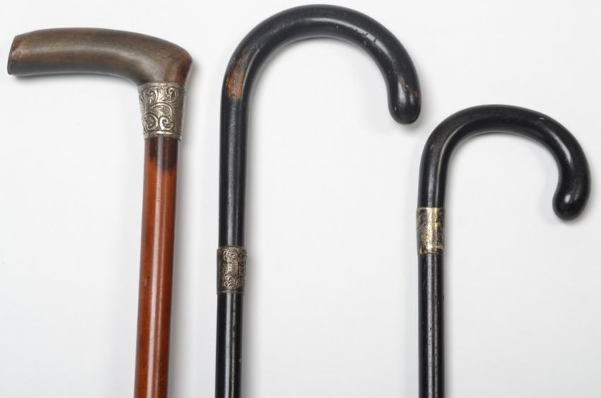 A group of three 19th and 20th century walking sticks / promenade canes, each fitted with applied silver hallmarked collars
