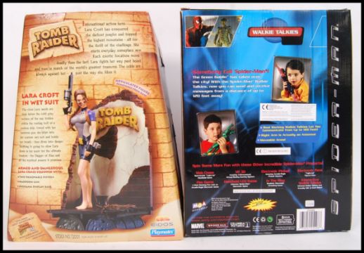 A collection of 2x contemporary toys to include; MGA Entertainment Spiderman Walkie Talkies & Playmates Tomb Raider Lara Croft in wet suit. Both within their original boxes.