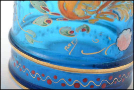 Two 19th century blue Bohemian glass pieces by Royo having floral sprays and chicken enamelled decoration, one being a lidded pot the other being a tall glass with circular foot and gilded knopped stem. Tallest measures 20 cm