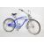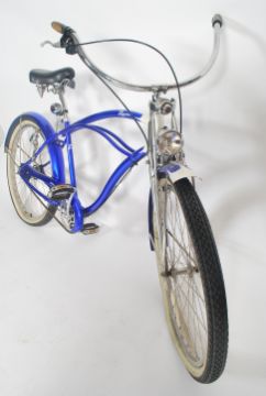 A vintage 20th century fixed speed two tone blue and white beach cruiser bike / bicycle by Dyno having an oversized low saddle, sweeping frame and fantastic Cowhorn handle bars.