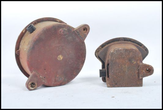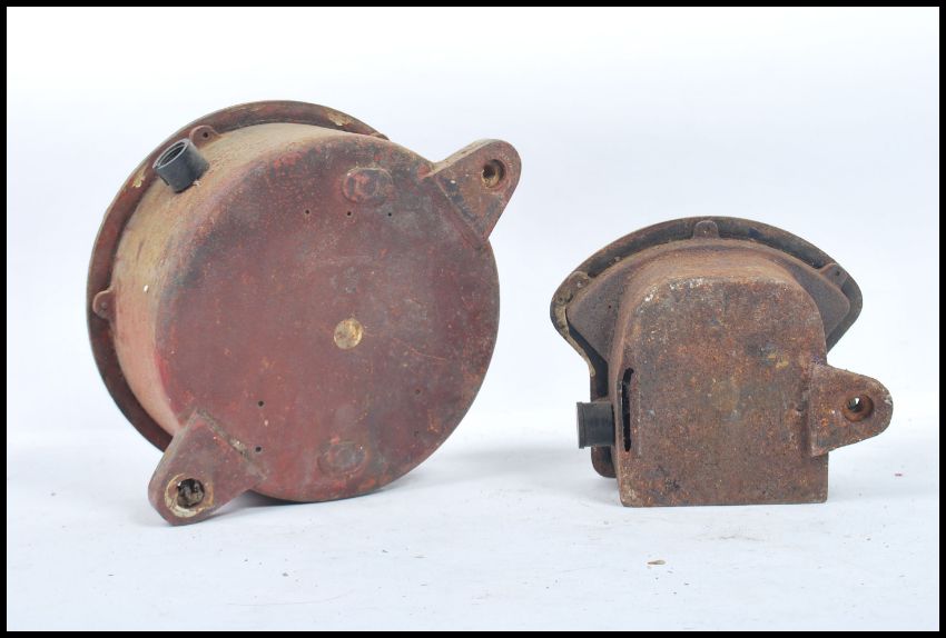 2 20th century Industrial large bulkhead volt and ampere meters. Each with white dials in heavy metal bulkhead cases