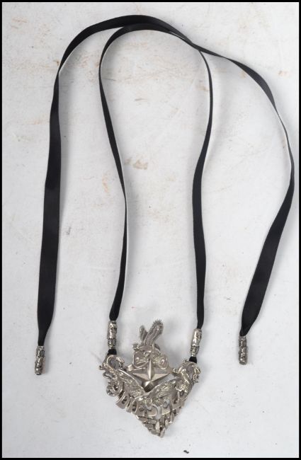 A sterling silver gentleman's necklace pendant stating ' Diesel ' with eagles stars and snakes mounted on a black necklace complete in original box. Stamped 925.