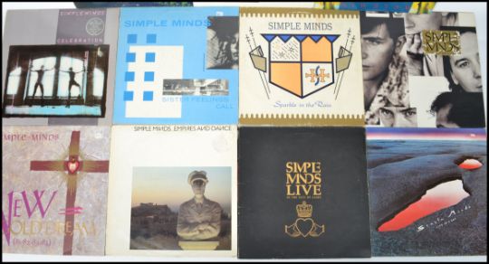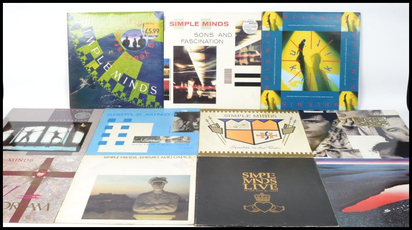 A collection of eleven long play LP vinyl records by Simple Minds to include Celebration, New Gold Dream, Sister Feelings Call, Empires and Dance, Sparkle In The Rain, Live, Once Upon A Time, Life In A Day, Street Fighting Years, Sons And Fascination and Kick it in together with Don't You on 12" vinyl.