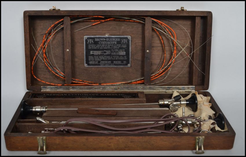 An early 20th century cased Brown Buerger Cystoscope, appears to be complete and bearing makers plaque to the case for American Cystoscope Makers Inc. Measurements: 6 cm high, 36 cm wide and 16 cm deep.
