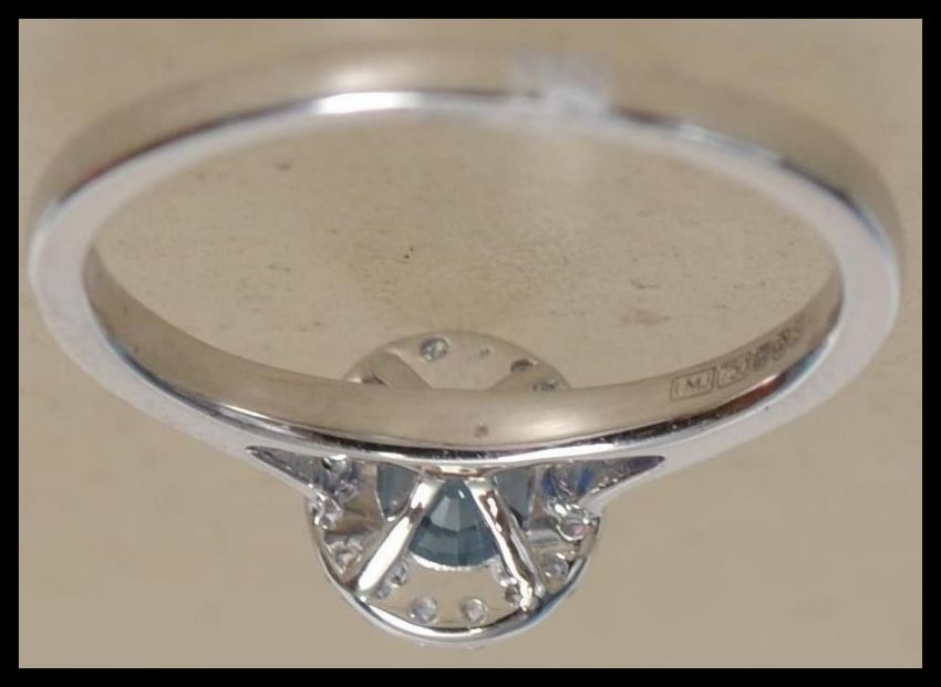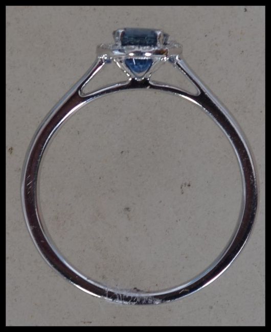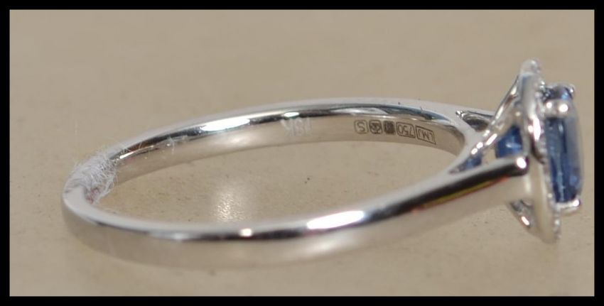An 18ct white gold, sapphire and diamond cluster ring of approx 1ct  with stunning halo of diamonds. Total weight 2.9g / size N.5