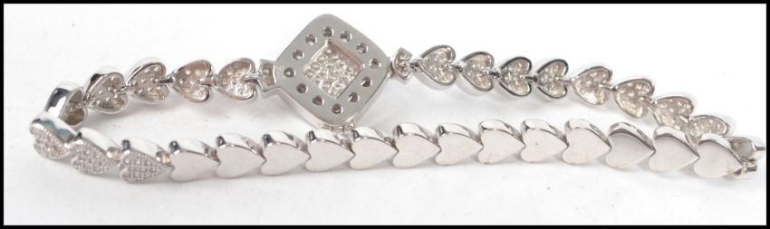 A ladies contemporary silver and cz adorned heart shaped line bracelet with link formations and clasp