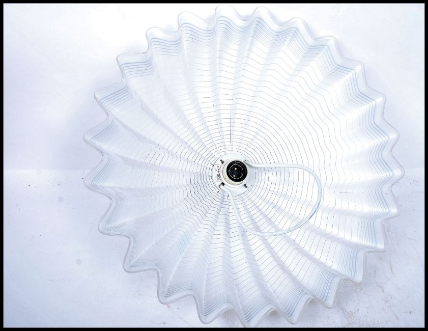 A vintage mid 20th century retro rise and fall light fixture having a pleated umbrella shade with bands of black lines.