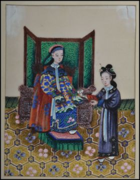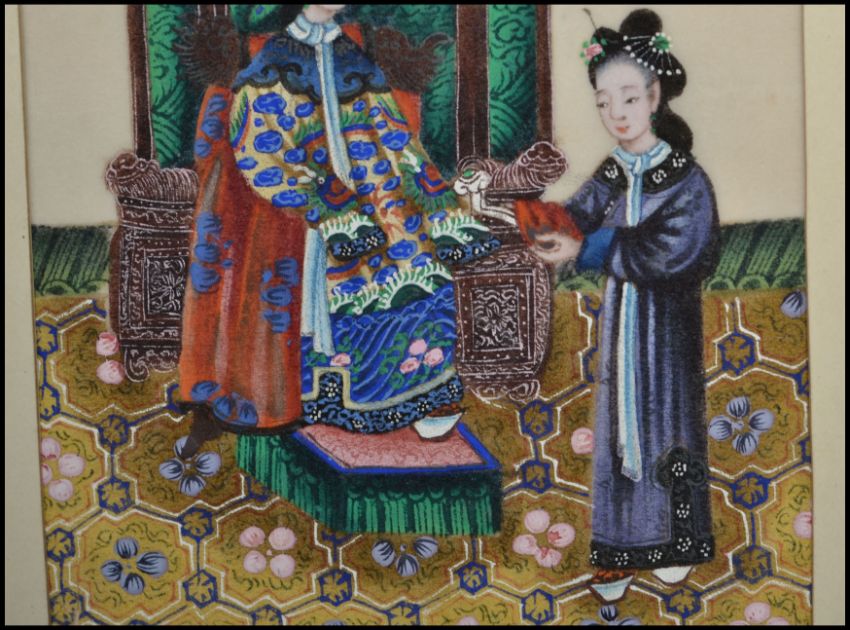 A 19th century Chinese silk needlework picture of a high status female court scene.