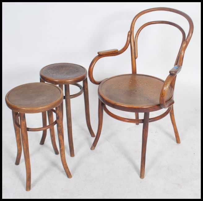 A good early 20th century bentwood cafe dining chair carver armchair. The panel seats having turned legs with upper peripheral stretchers and arched back together with 2 similar stools. Measures 86cms by 56cms by 56cms.