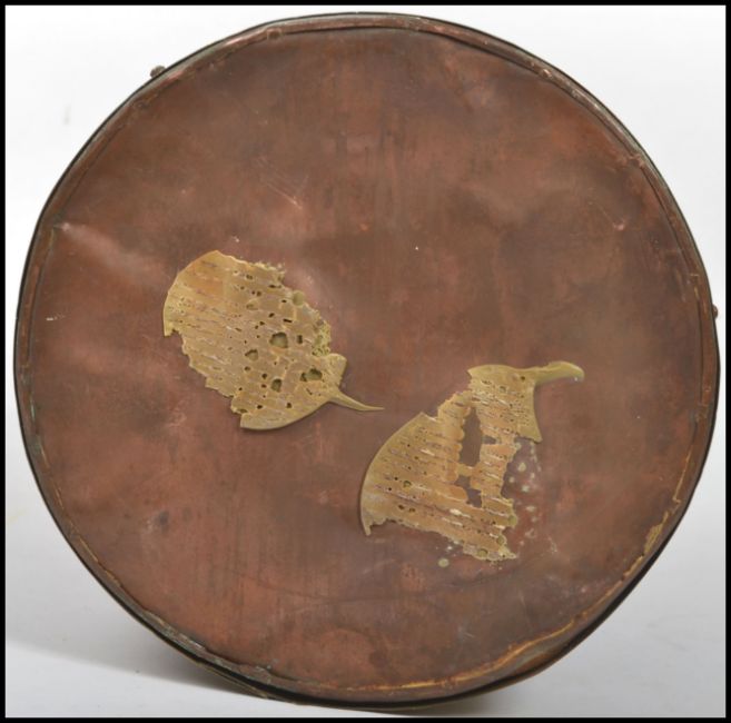 A large early 20th century agricultural copper and brass dairy milk churn with looped swing handle to top and brass bands to body. Measurements: 57 cm high and 24 cm wide.