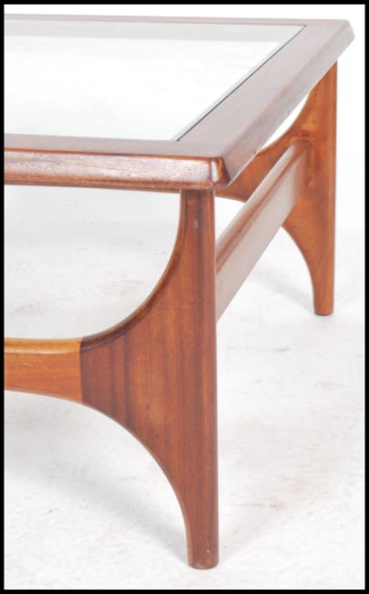 A Stonehill for Stateroom square teak wood table having a square inset glass top and shaped legs united by surrounding stretchers.