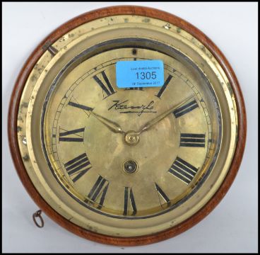 A early 20th century brass bulkhead nautical ships clock having a roman numeral chapter ring, faceted hands and a wooden plinth base.