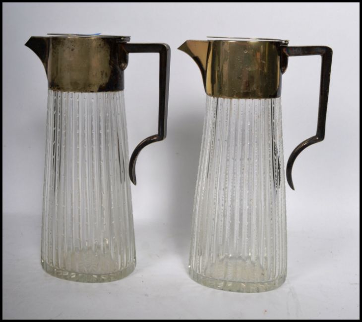 A pair of early 20th century silver plated and dimple glass Claret jugs, the glass bodies of tapering form surmounted by silver plated handles and lids.