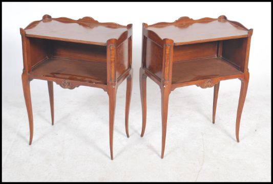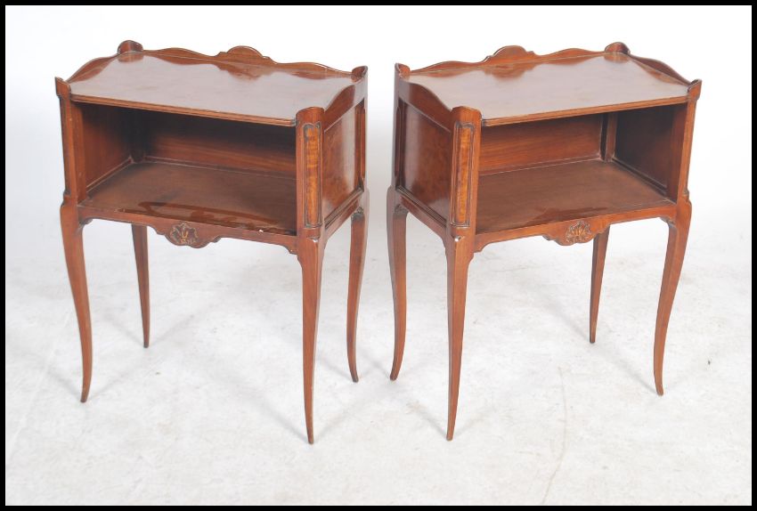 A pair of 19th century walnut and oak French gallery topped bedsides raised on shaped tapering legs with carved fluer de lis to front with open fronts and walnut panels. Measures 68cms by 52cms by 30cms.