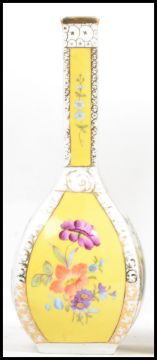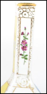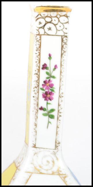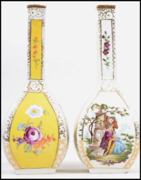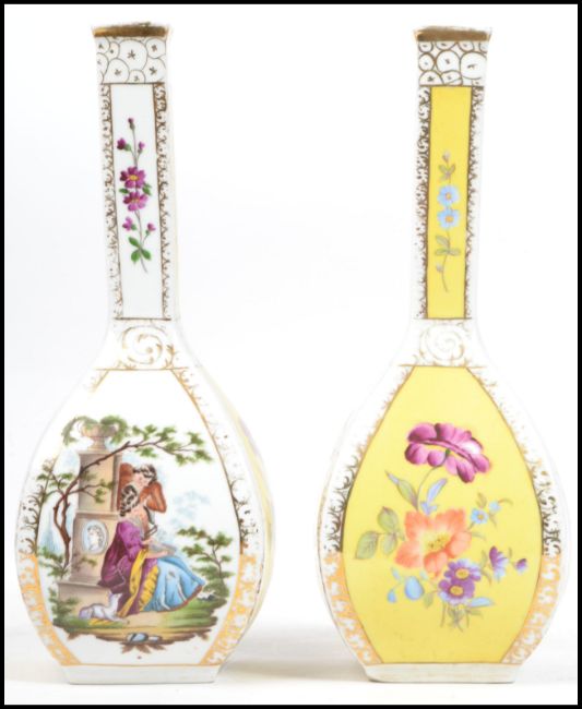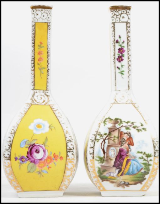 A pair of believed 19th century continental (possibly Meissen) onion vases having cartouche panels depicting scenes of courting ladies and gentlemen and famile Juan panels with floral decoration. The vases having a prominently white ground with gilt and painted detailing the body of bulbous square form with a rectangular elongated neck with gilt flared rim. Blue cross swords marks to base. Measurements: 31.5 cm high and 12 cm deep.