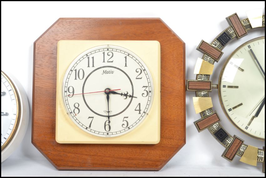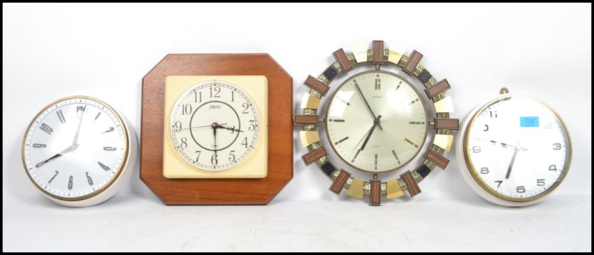 A collection of vintage 20th century retro clocks to include a Metamec Aztec clock, Motif, and two other circular Metamec clocks.
