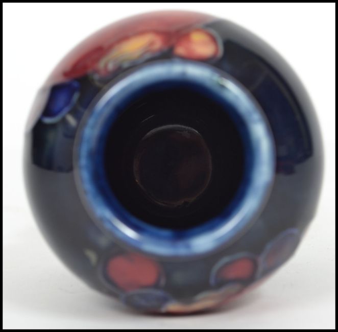A 20th century William Moorcroft tubelined baluster vase decorated in the iconic pomegranate and grape pattern. The globular body raised on a splayed foot with plain rim. Impressed green Made In England stamp mark to base with blue William Moorcroft signature and having ‘ Potter to HM Queen ’ at bottom right. Measures 8.5 cms high. Condition Report: Had an early repair but overall in good order.