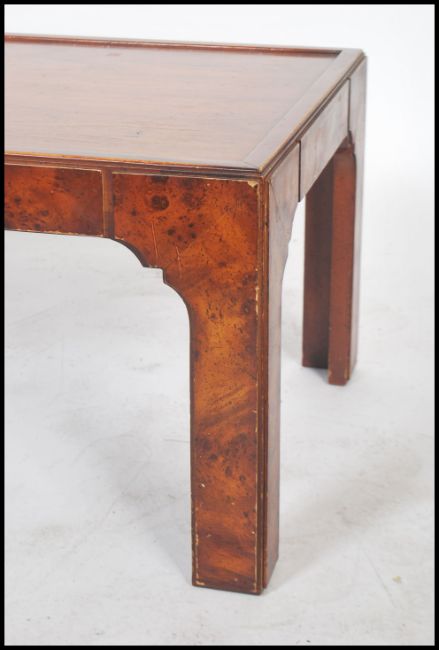 A Chinese style walnut rectangular coffee table with plain flush panelled top and raised on square shaped supports. Matching pair of occasional tables in lot 1248. Measures 50cms Cube.