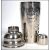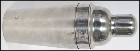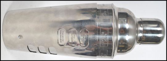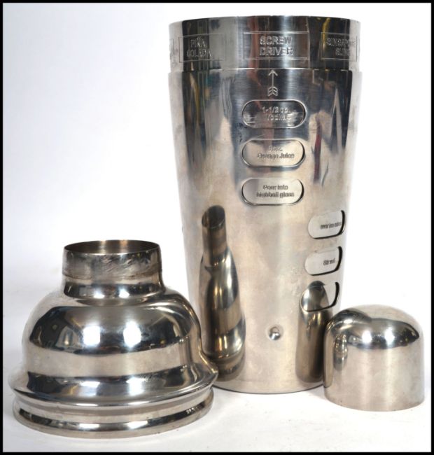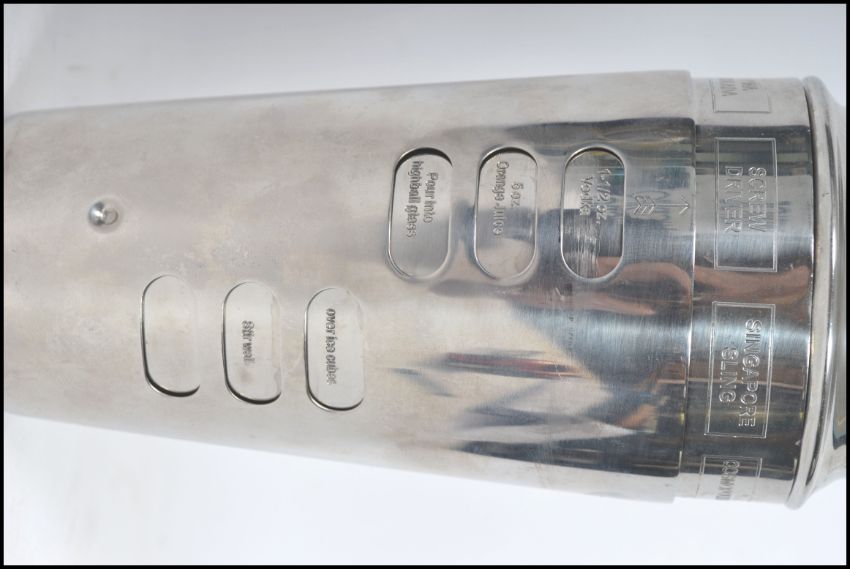 A stunning 20th century white metal cocktail shaker of usual form having a revolving outer sleeve rotating to reveal different cocktail recipes.