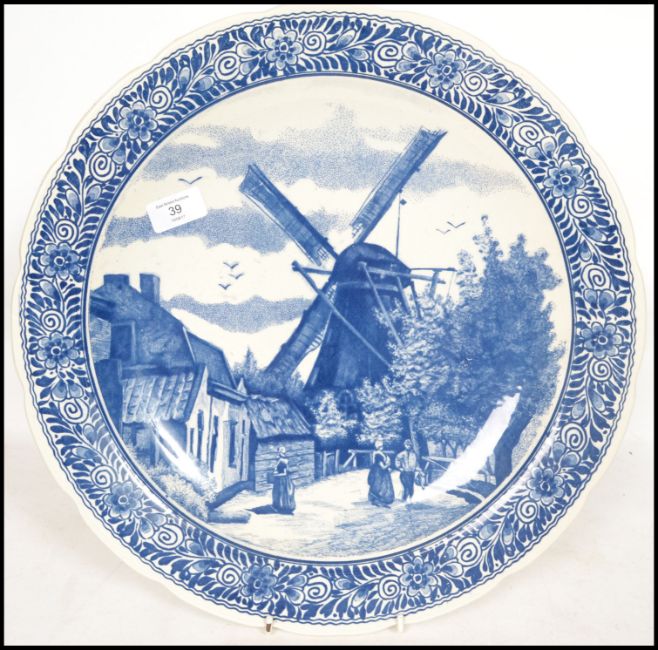 A 20th century Delft ceramic wall hanging charger plate having a central tondo depicting a traditional Dutch scene with leaf and flower border work and scalloped edge. Stamped to back Delfts Blauw Chemkefa.