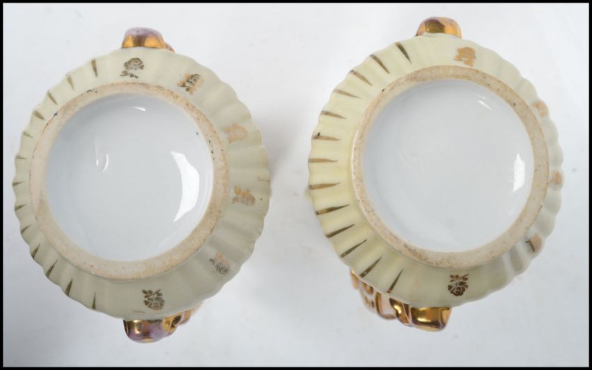 A pair of 19th century Victorian continental vases having gild twin handles with flared rims and cartouche panels depicting children. Measurements: 28 cm high, 15 cm wide and 10 cm deep.