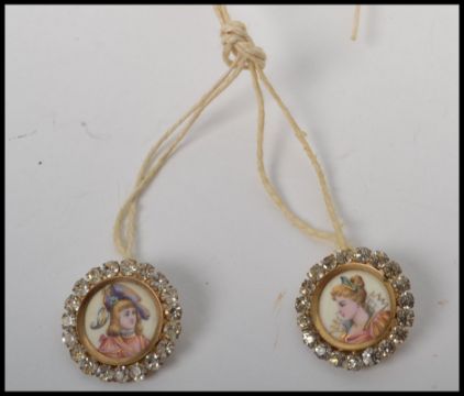 A pair of stunning 19th century continental hand painted portrait buttons, having portraits of a young lady and her beau, bordered by a ring of mounted clear stones.