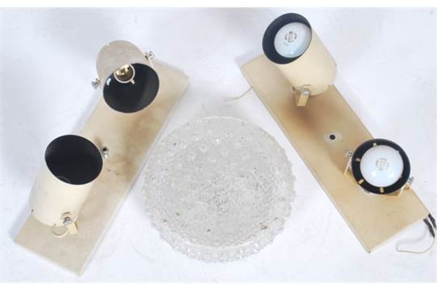 A 1980's retro adjustable twin spot chrome floor standing spot light lamp with pendant shades and terraced base with chrome column together A collection of retro 20th century ceiling lights to include a pair of ceiling twin spot lights etc