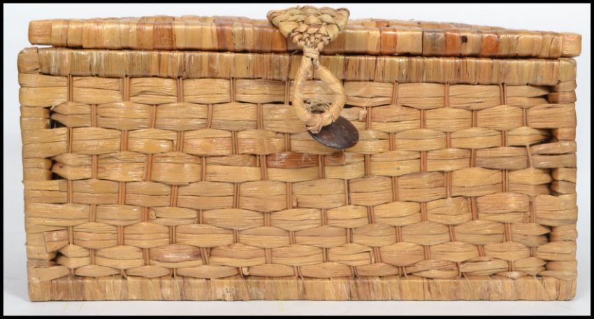 A collection of vintage artist paint, brushes and equipment all contained within a vintage wicker work box. Measurements: 27 cm high and 58 cm wide and 30 cm deep.