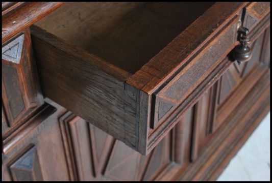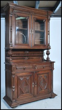 A 19th century French  buffet du corps, the pair of geometric panel doors over turned gallery, pair of drawers and further pair of geometric cupboards, Measures 234cms by 126cms by 54cms