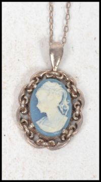 A group of sterling silver jewellery to include a silver two strand rigid cross over bangle 23.5 grams, a fancy link necklace chain with lobster claw clasp weighing 26.3 grams. a charm bracelet weighing 12.4 grams and a Wedgwood cameo necklace and earrings demi-parure.