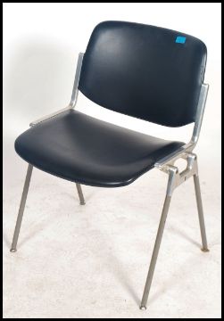 A 20th century DSC 106 stacking chair by Giancarlo Piretti for Castelli. Stamped to aluminum frames and labeled to the underside of the seat being upholstered in black vinyl.