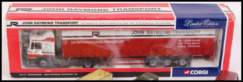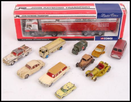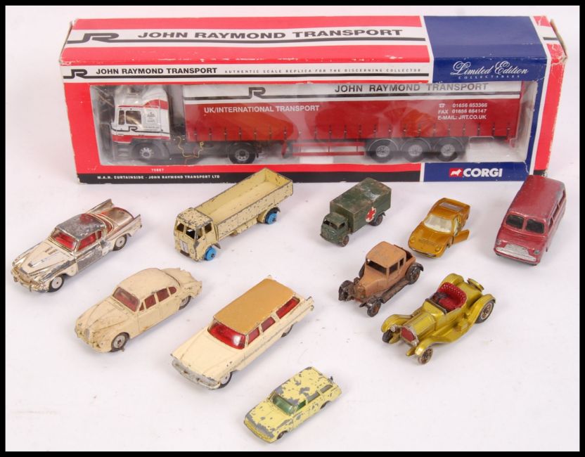 An assorted collection of loose Corgi & Dinky diecast model cars to include; Bedford Dormobile, Studebaker Golden Hawk, Plymouth Sports Suburban, 1913 Cadillac & others. Also to include Corgi 75807 John Raymond Transport Ltd MAN Curtainside lorry. Within the original box.