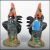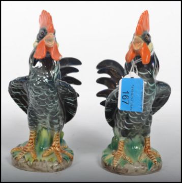 A pair of hand painted 20th century Majolica cockerels raised on naturalistic plinth bases having continental marks to base with a rose. Numbered 4158 347/2. Measurements: 17 cm high, 9 cm wide and 11 cm deep.