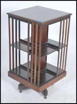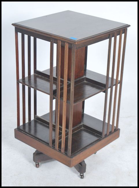 An Edwardian mahogany revolving bookcase having slatted sectional body raised on swivel column with quadruped ceramic castors to base. Measures 88cms x 47cms x 47cms